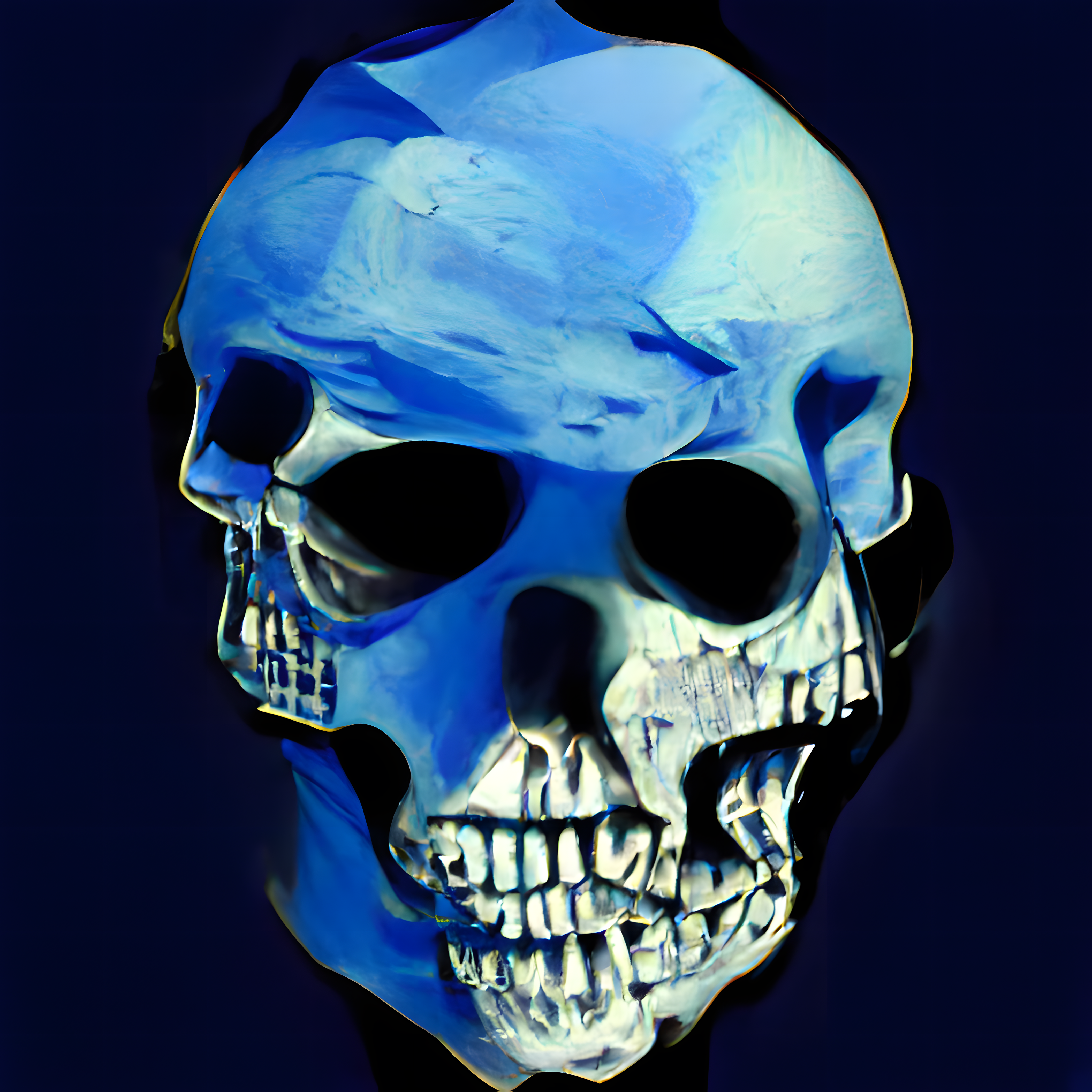 Artwork #1304 of the skulls.ink NFT collection was drawn from shades of black, royalblue, darkslategray, darkolivegreen, midnightblue, cornflowerblue, lightsteelblue and saddlebrown.